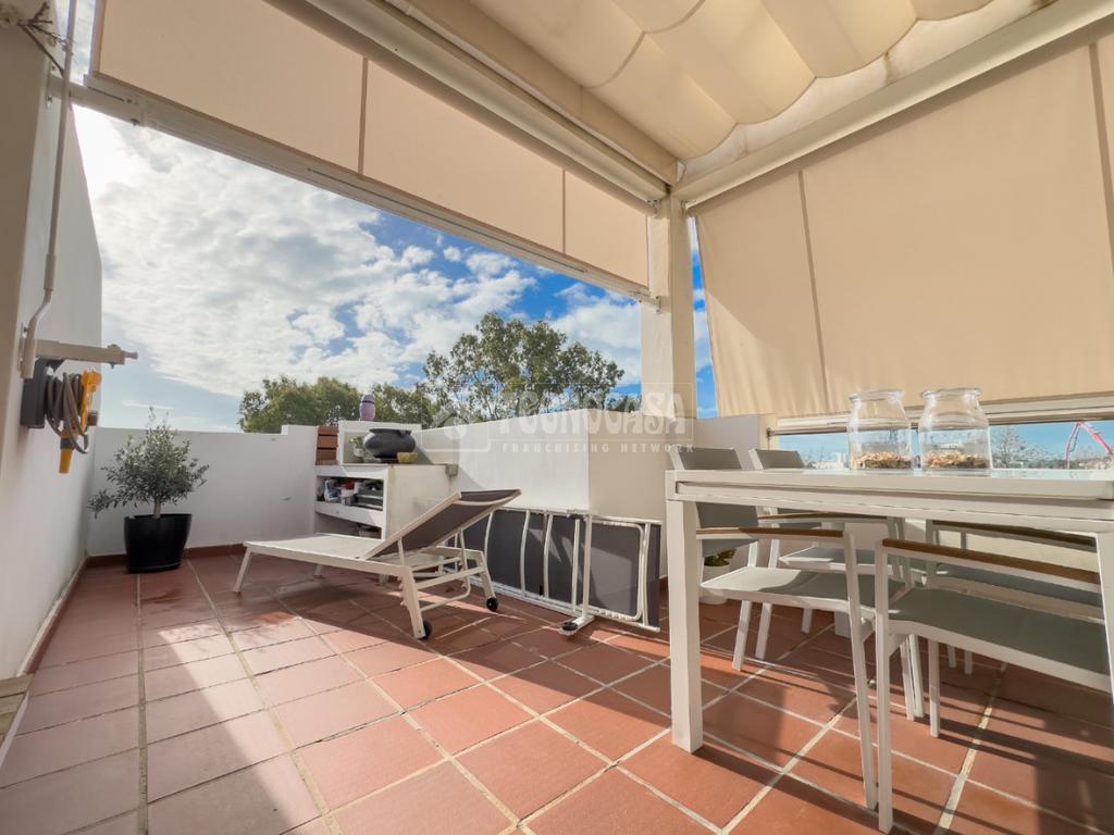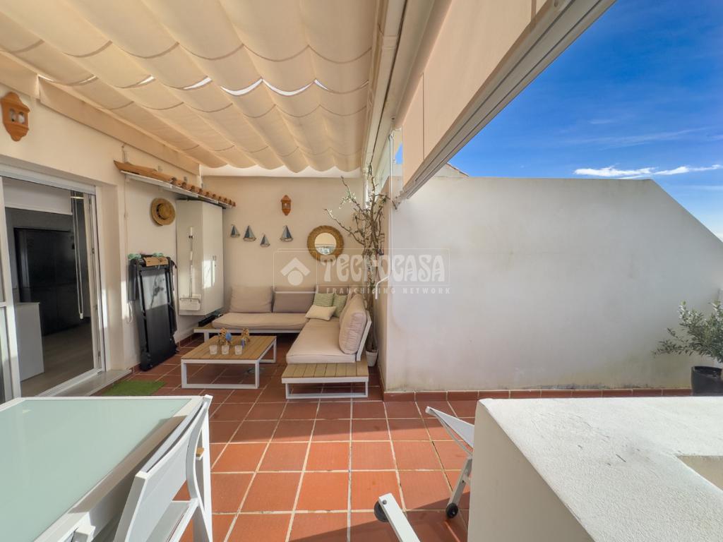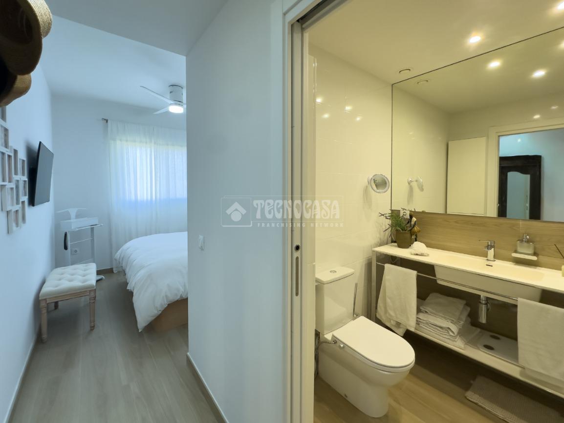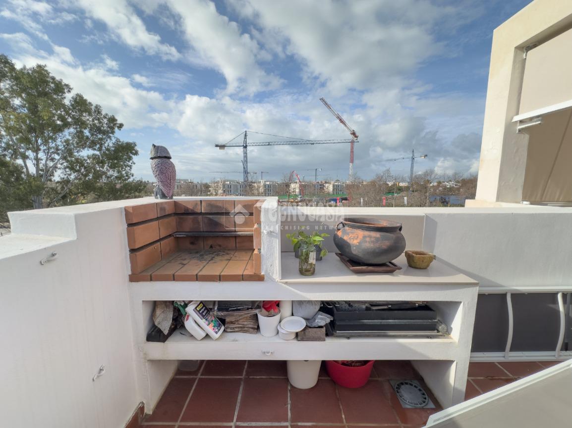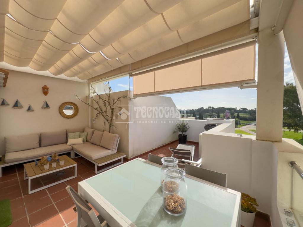 En Costa Ballena, ÁTICO de recién construcción en el residencial de JARDINES DEL LAGO, se distribuye en 2 dormitorios, 2baños, terraza y 2 plazas de garaje más trastero. La vivienda cuenta de 3 orientaciones por lo tanto dispone de luz durante todo el día. Además de su exterioridad y su orientación cuenta con unas inmejorables vistas a los jardines y lagos. Dentro del residencial su ubicación es una de las mejores porque queda completamente independiente sin colindar con vecino alguno, por lo que le confiere de tranquilidad todo el año, ya que no tiene ni vecinos arriba ni junto a su terraza. La vivienda además de ser de recién construcción, cuenta de mejoras hechas lo que hace que sea aún más exclusiva. Se distribuye en: entrando a mano derecha tiene la cocina con estupendos acabados abierta al salón con vitro y campana extractora tipo 'downdraft', cuenta de 2 ventanas y salida a la terraza. La zona exterior dispone de varios toldos de palillería y otro vertical dejando una parte para poder disfrutar verano e invierno y otra parte completamente exterior donde se sitúa la barbacoa. Los dormitorios son dobles, con armarios empotrados y vestidos, en cuanto a los baños ambos son completos con plato de ducha y mueble de lavabo de diseño minimalista.
