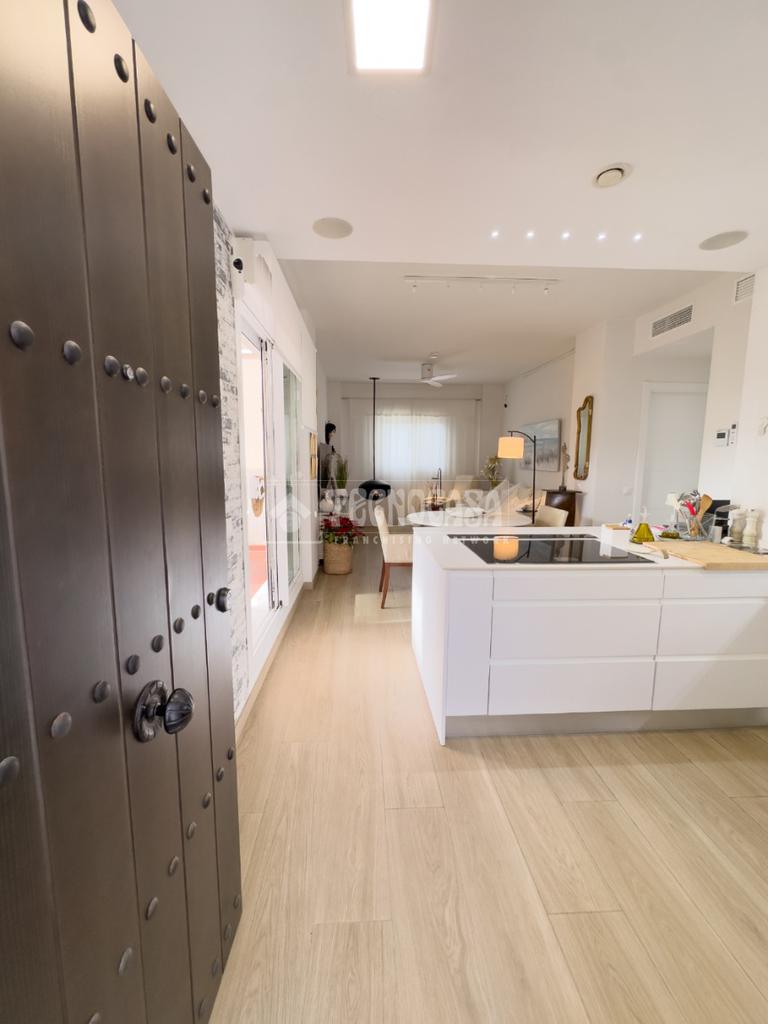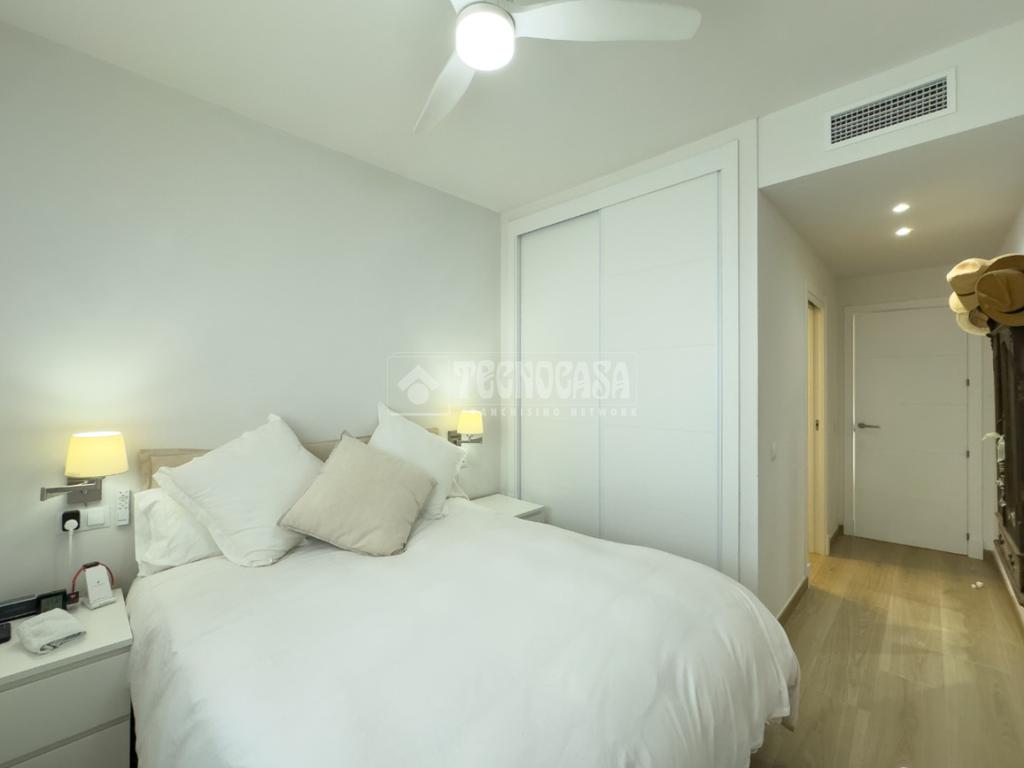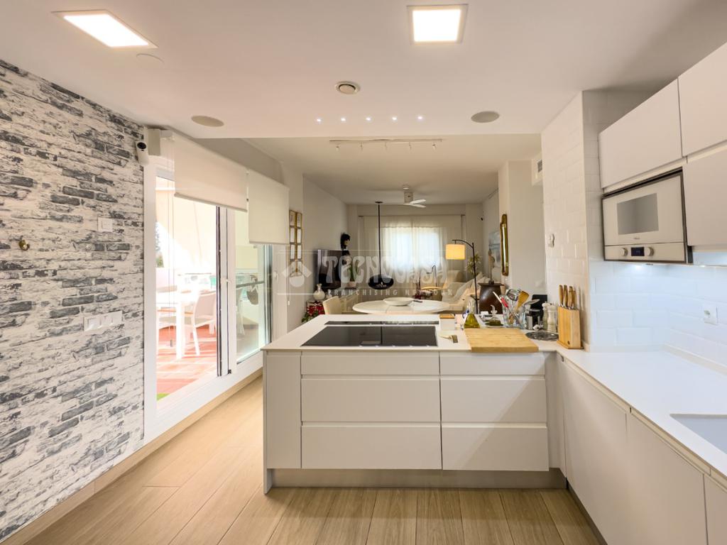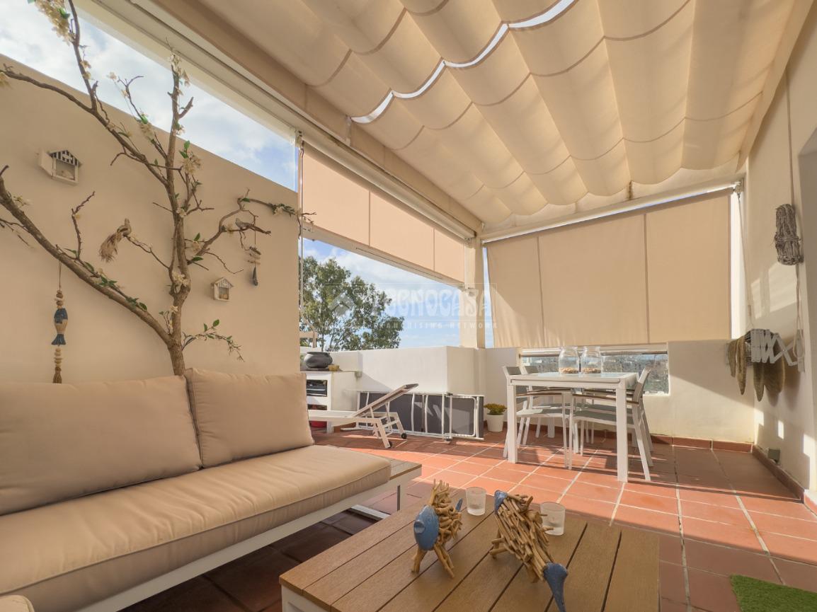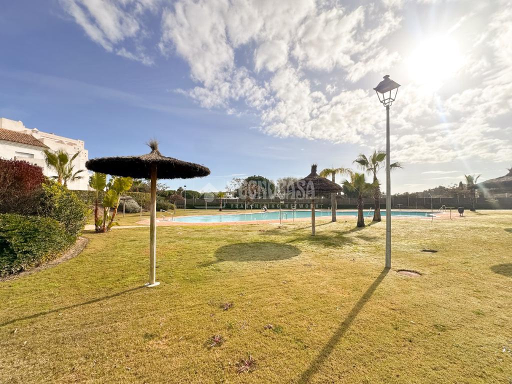 En Costa Ballena, ÁTICO de recién construcción en el residencial de JARDINES DEL LAGO, se distribuye en 2 dormitorios, 2baños, terraza y 2 plazas de garaje más trastero. La vivienda cuenta de 3 orientaciones por lo tanto dispone de luz durante todo el día. Además de su exterioridad y su orientación cuenta con unas inmejorables vistas a los jardines y lagos. Dentro del residencial su ubicación es una de las mejores porque queda completamente independiente sin colindar con vecino alguno, por lo que le confiere de tranquilidad todo el año, ya que no tiene ni vecinos arriba ni junto a su terraza. La vivienda además de ser de recién construcción, cuenta de mejoras hechas lo que hace que sea aún más exclusiva. Se distribuye en: entrando a mano derecha tiene la cocina con estupendos acabados abierta al salón con vitro y campana extractora tipo 'downdraft', cuenta de 2 ventanas y salida a la terraza. La zona exterior dispone de varios toldos de palillería y otro vertical dejando una parte para poder disfrutar verano e invierno y otra parte completamente exterior donde se sitúa la barbacoa. Los dormitorios son dobles, con armarios empotrados y vestidos, en cuanto a los baños ambos son completos con plato de ducha y mueble de lavabo de diseño minimalista.